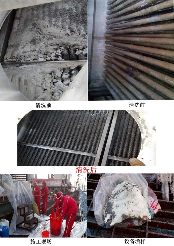 復合型蒸發式冷卻器上部是風冷式,下部為水冷式。因此上部翅片管束表面由于接觸環境大氣、易于積存油膩、塵垢、煙垢、柳絮等附著物,形成較大的熱阻,污垢的存在將大大降低甚至喪失鋁翅片冷換設備的冷卻作用。另外鋁翅片表面的污垢也會促使垢下腐蝕。下部水冷式光管表面由于外部環境條件影響,并且由蒸發式空冷器的特點,造成循環冷卻水濃縮快,濃縮倍率高,硬度,堿度高,濁度高等困難。在長期運行過程中,空冷器光管束表面生成了很厚的硬垢,嚴重影響了空冷器換熱效果,增加了能耗,影響了正常生產和安全。為了保證設備安全,穩定運行,延長使用壽命,提高冷卻效率,應對其進行定期清洗。